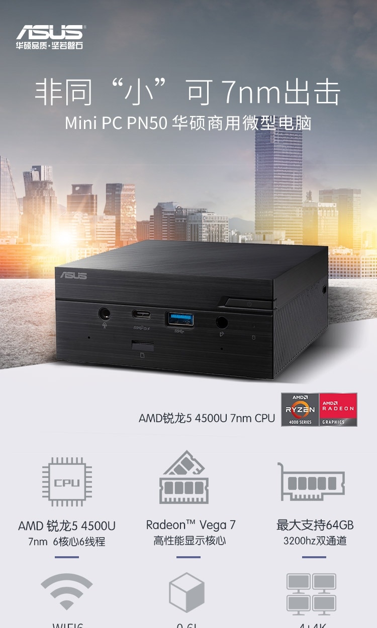 华硕(ASUS) PN50 商用办公教育Mini迷你台式机微型电脑主机 (AMD锐龙六核R5 4500U 8G 512G Win10 3年上门)